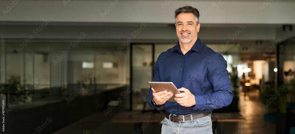 • Portrait of happy 50 years old business man executive standing in office using digital tablet. Middle aged businessman manager business owner working on professional finances project looking at camera