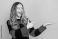Owoce - Excited young woman in casual striped sweater pointing and smiling with cheerful expression on... #1888923054