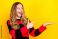 • Excited young woman in casual striped sweater pointing and smiling with cheerful expression on vibrant yellow background