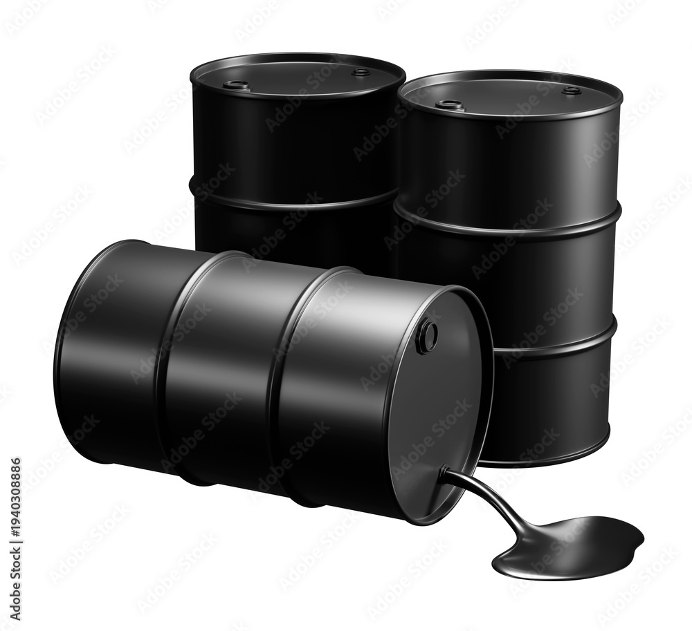 • Black oil barrels with spilled crude oil isolated on transparent background 3D render