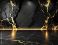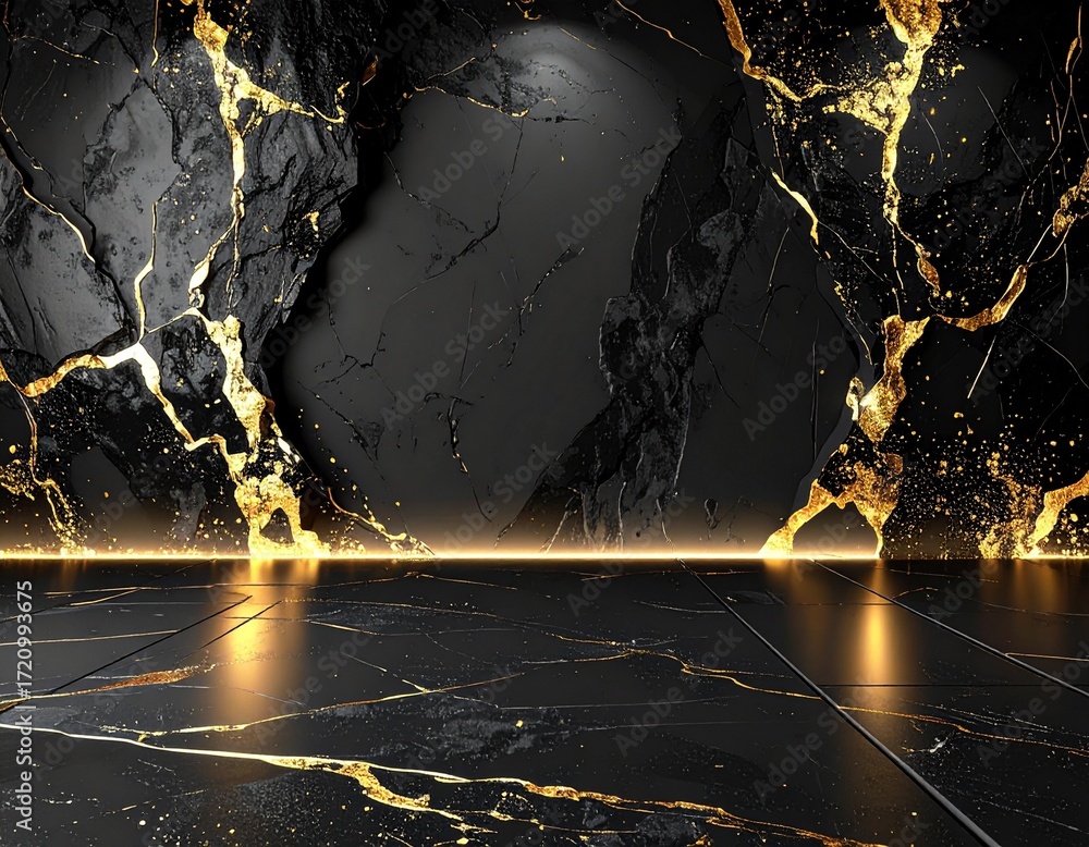 Czarny - Czarna ściana i podłoga ze złotymi, świecącymi pęknięciami. Puste pomieszczenie, tło produktowe.... #1720993675