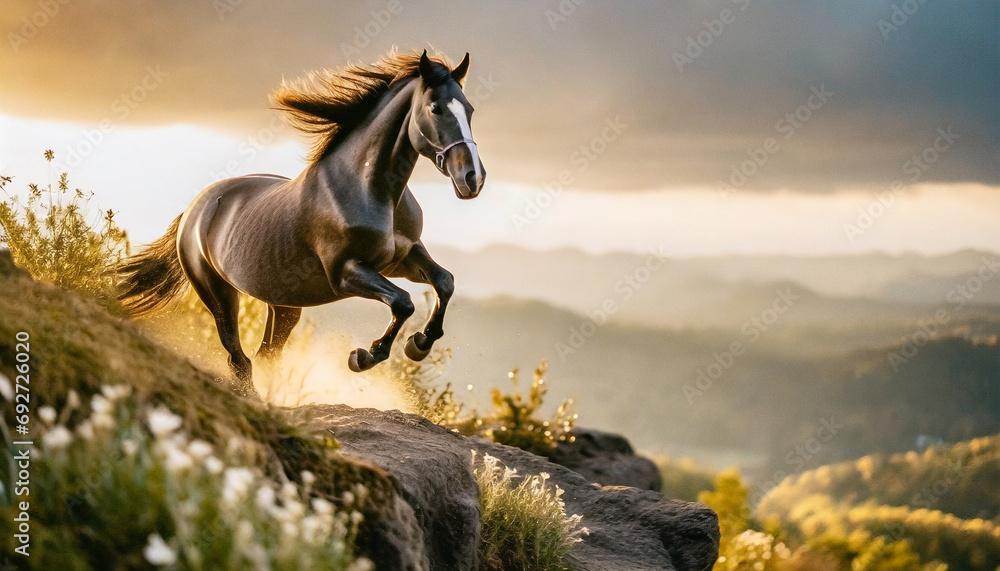 • Czarny koń skaczący nad urwiskiem, magiczna godzina, piękne kolory dnia