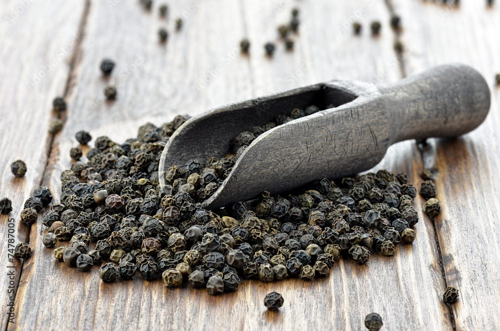Czarny - Ziarna pieprzu na drewnianej łyżce #74787005