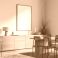 • Empty poster template in stylish dining room interior with wooden chairs, decor elements, and soft lighting on neutral wall background for layout design. 3D Rendering