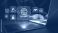 A futuristic hand displaying a digital marketing dashboard featuring key elements like web, social media, content, SEO, and advertising strategies for businesses. Synapse