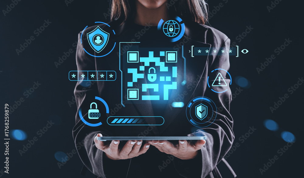 • Businesswoman holding tablet with digital QR code and cybersecur