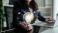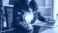 Woman chats on phone at home office