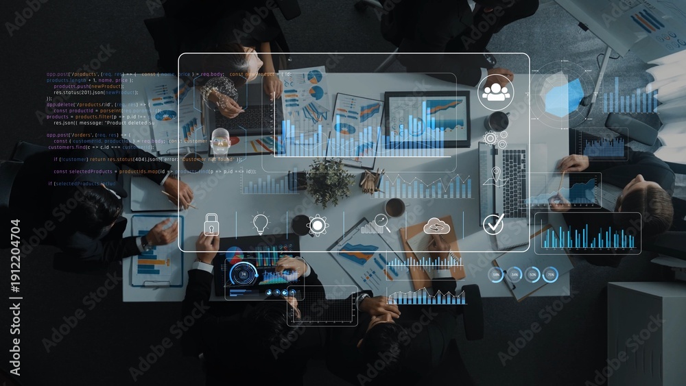 • A diverse team engages in a strategic meeting, analyzing charts and data on a laptop and documents, with a digital overlay showcasing insights and analytics. Raster