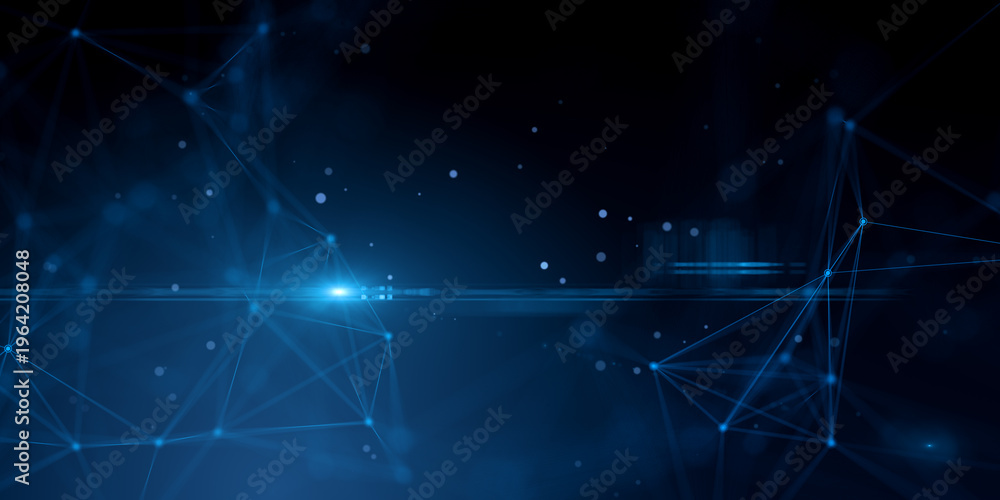 • Abstract blue neon network lines and glowing points forming modern digital backdrop texture on dark background connecting nodes design. 3D Rendering