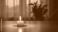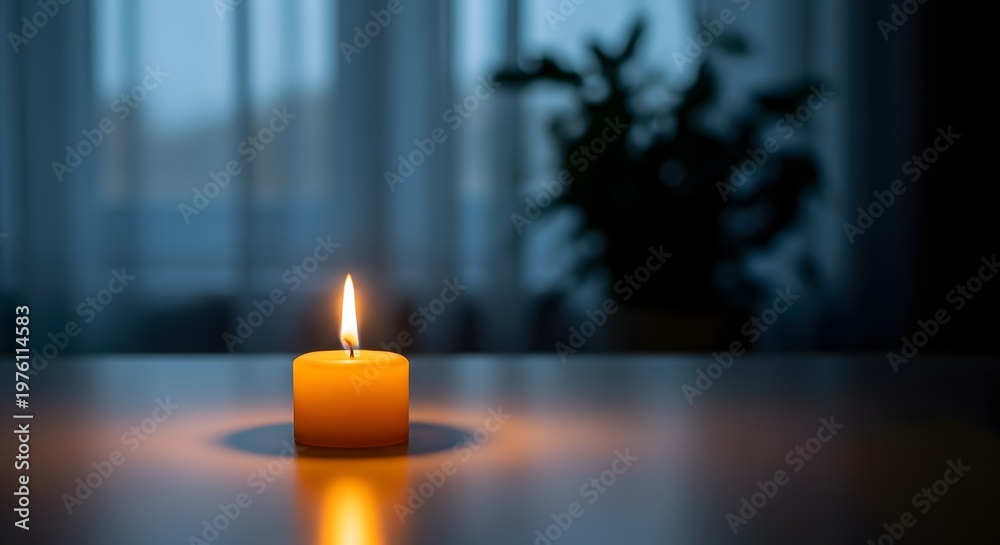 • Satu lilin menyala di atas meja dengan latar belakang gelap dan bayangan tanaman