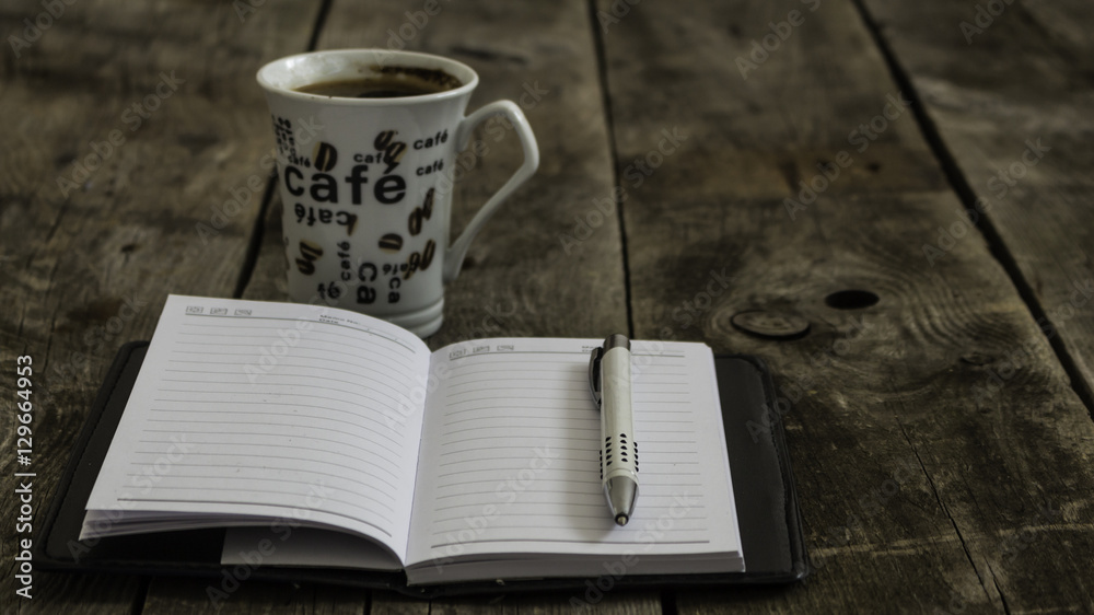 Kawa - Kubek kawy z notesem i długopisem na drewnie #129664953