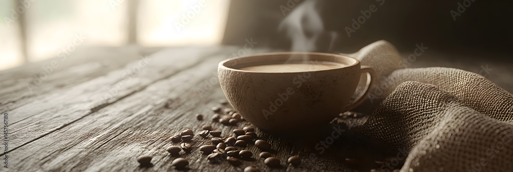 • Steaming Coffee Cup – Warm Beverage with Coffee Beans on Wooden Table