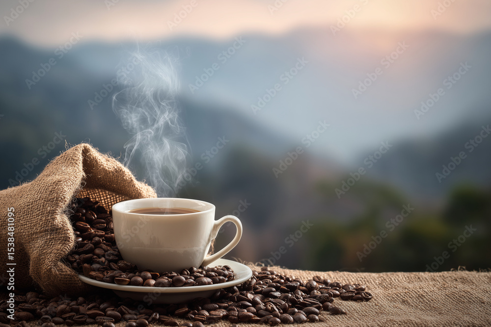 • A white coffee cup with steam coming out of it is sitting on a table with coffee beans. The scene is peaceful and relaxing, with the mountains in the background adding to the serene atmosphere
