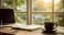 • Home office z laptopem, kawą i notesem przy oknie w porannym świetle słonecznym