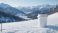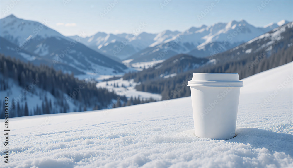 Kawa - Biały jednorazowy kubek na wynos z kawą napojem stojący na śniegu na tle ośnieżonych szczytów... #1852010302