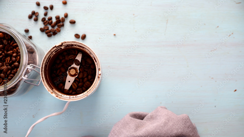 Kawa - Młynek do kawy z rozrzuconymi ziarnami kawy #230988043