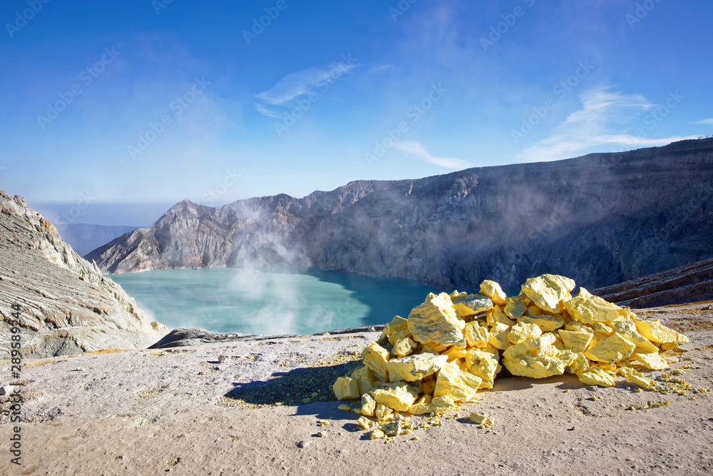 Kawa - The sulfuric lake of Kawah Ijen vulcano in East Java with sulfur stone in foreground, Indonesia #289589244
