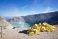 • The sulfuric lake of Kawah Ijen vulcano in East Java with sulfur stone in foreground, Indonesia