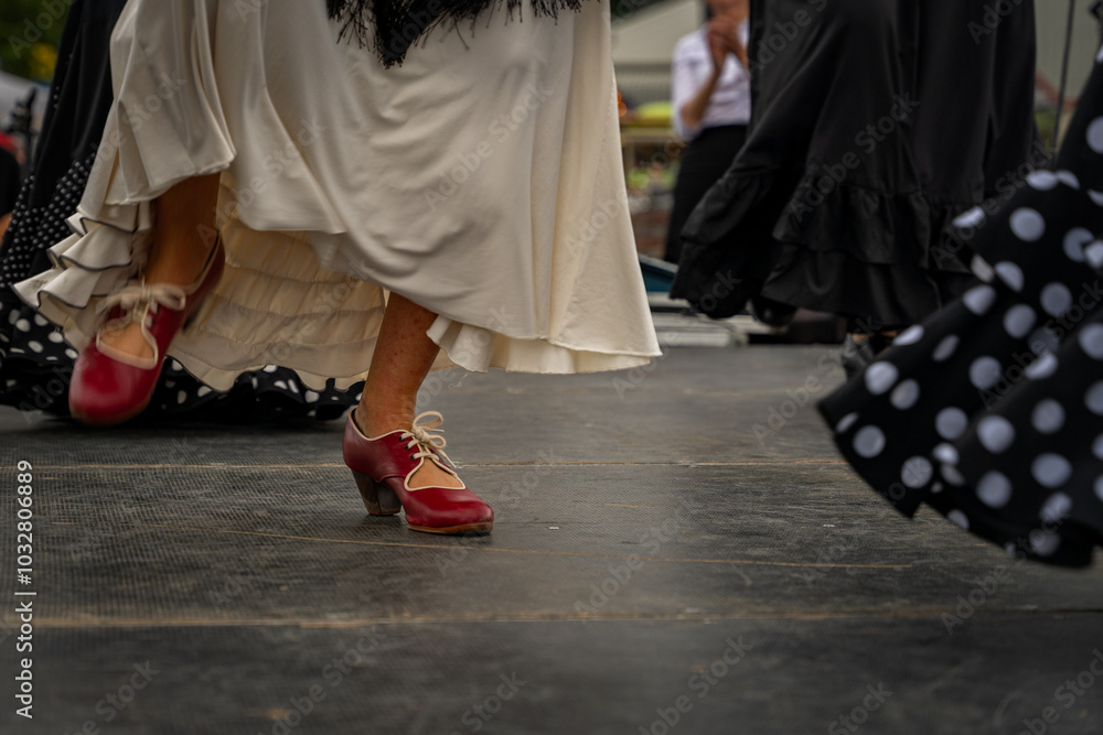 Taniec - Wirujący taniec, zbliżenie na nogi tancerek flamenco. #1032806889