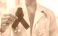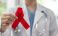• World aids day and national HIV AIDS and ageing awareness month with red ribbon on medical or surgical doctor's hand in hospital background