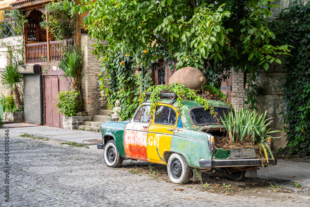 Auta - Stary samochód pomalowany na kolorowo z kwiatami na ulicy starego miasta #1043090546