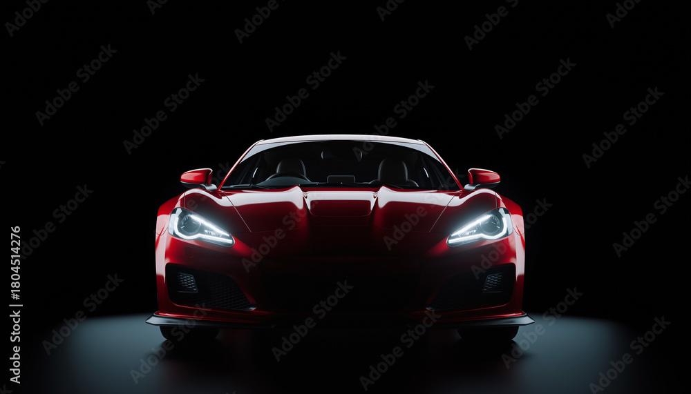 Auta - Piękny, czerwony, sportowy samochód z włączonymi światłami na czarnym tle #1804514276
