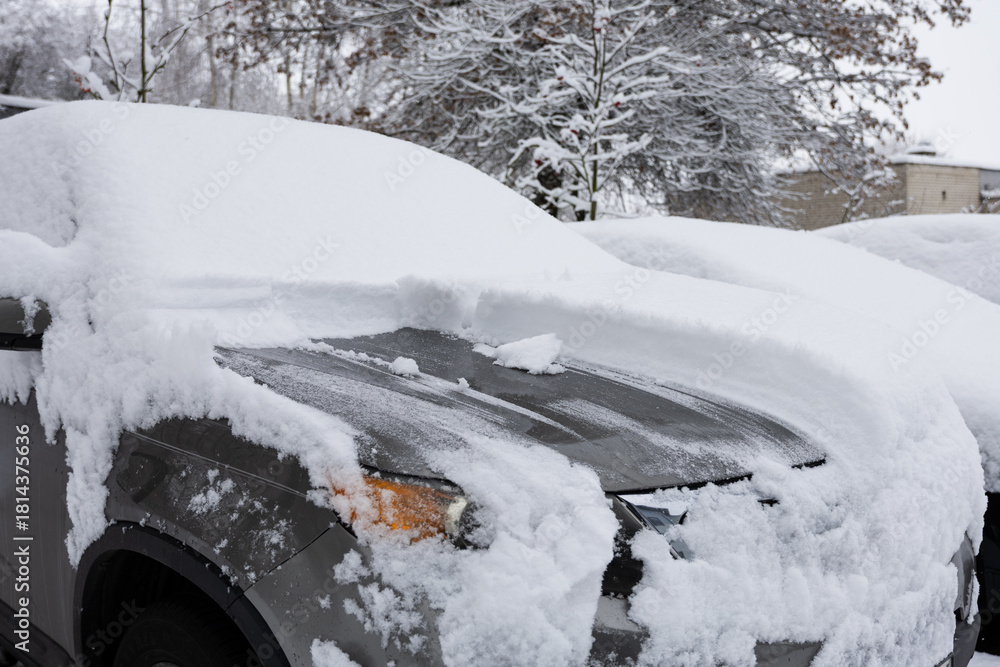 Auta - częściowo odśnieżony samochód zimą. #1814375636