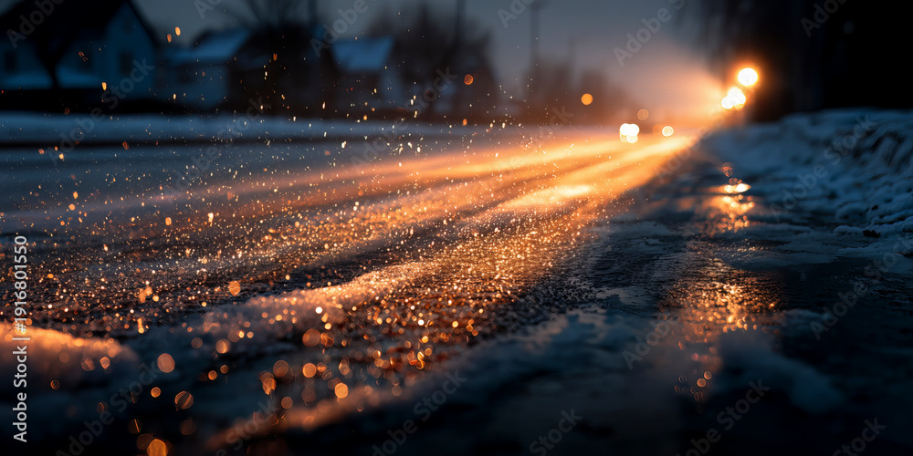 Auta - Mokra ulica o zmierzchu odbijająca migoczące światła przejeżdżających samochodów w miejskim... #1916801550