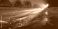 • Mokra ulica o zmierzchu odbijająca migoczące światła przejeżdżających samochodów w miejskim otoczeniu