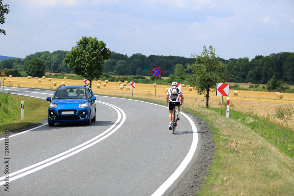 • Samochód osobowy i rowerzysta, kolaż na zakręcie pięknej drogi asfaltowej.