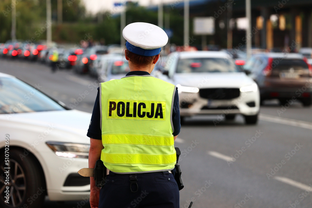 Auta - Policjantka kieruje ruchem drogowym wieczorem podczas szczytu w korkach ulicznych. #510702650