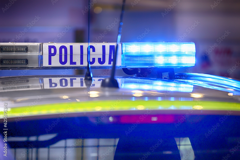 Auta - Radiowóz polska policja z Sygnalizator błyskowy niebieski na dachu radiowozu. Alarmowo wieczorem #625675242