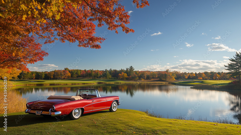 • Zabytkowy samochód kabriolet zaparkowany jest tuż przy cichym jeziorze, w otoczeniu zielonego pola golfowego i żywych barw jesieni.