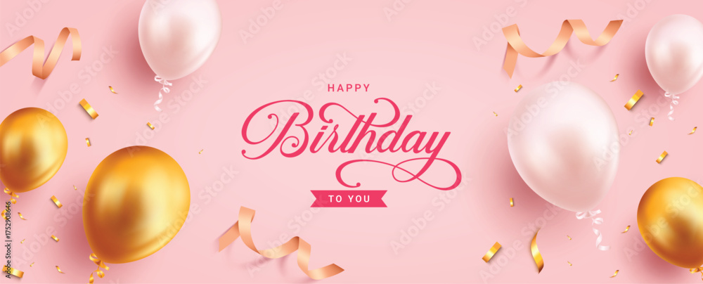 • Birthday greeting vector banner design. Happy birthday greeting text with metallic gold white balloons and confetti elements in pink background for birthday party celebration. Vector illustration