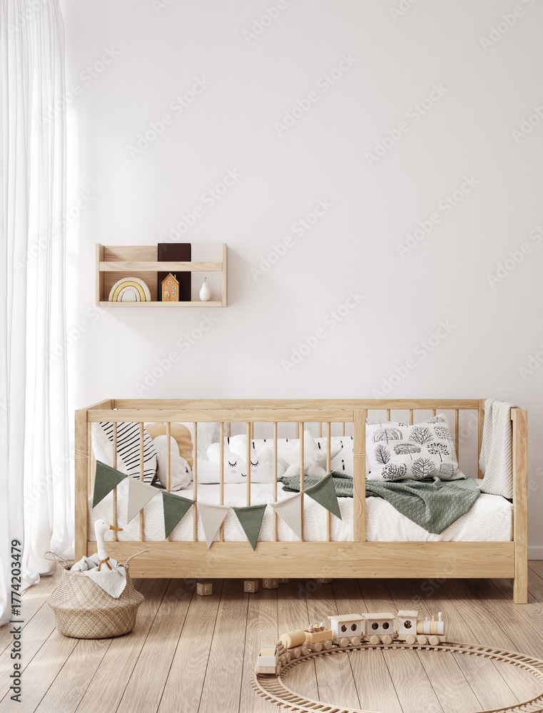 Kolej - Wall mockup in children room, light cozy interior with wooden crib, 3D render #1774203479
