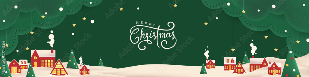 • Green Merry christmas and happy new year greeting card banner paper art style with snowy winter landscape red village and forest scene for holiday celebration and festive background