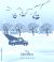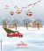 • Holiday Christmas background with a winter village and trees and red car. Vector.