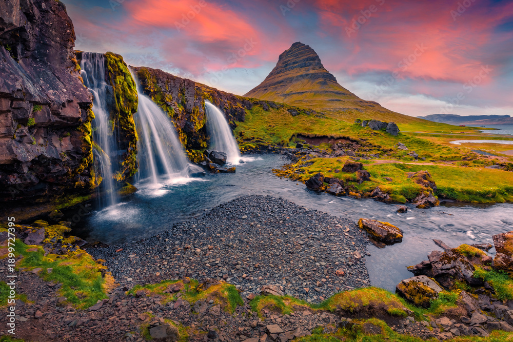 • Gorgeous morning view of popular tourast destination - Kirkjufellsfoss Waterfall. Astonishing sunrise on Snaefellsnes peninsula, Iceland, Europe. Beauty of nature concept background.