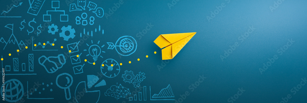 • Yellow paper plane and business strategy on blue background, Business success, innovation and solution concept, copy space