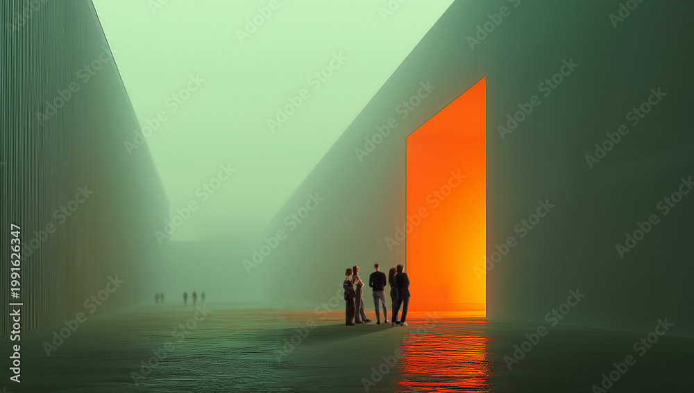 • Group of people entering glowing doorway in large futuristic architecture. Concept of digital installations, tech environments, collaborative exploration, and immersive future experience spaces.