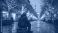 • Elderly man sits alone on street bench in city against bright holiday lights. He looks sad and cold amid festive decorations, symbolizing loneliness during Christmas and social issues.