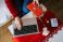 • Person writes CHRISTMAS SHOPPING LIST in notebook while holding small gift box on white coffee table. Online shopping, seasonal ecommerce, Christmas sales, holiday planning.