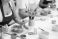 • Close-up of girl employee, she decorates and paints clay product, works in company of craftsmen and amateurs. Workshop for manufacture of authors products