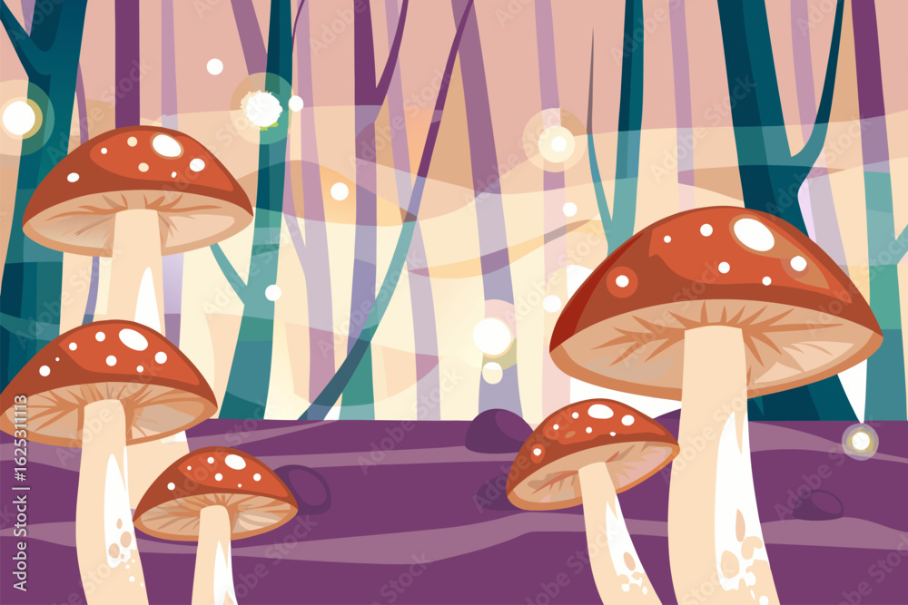 Bajki - Magiczne tło z muchomorami w tajemniczym, bajkowym lesie. Nastrojowa ilustracja wektorowa idealna... #1625311113