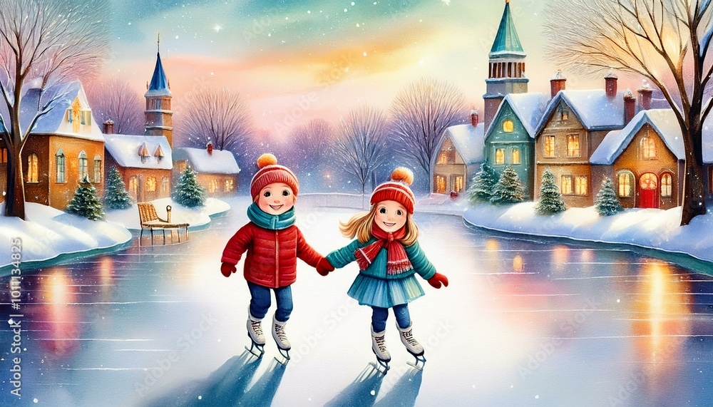 • Dzieci jeżdżące na łyżwach. Ilustracja, grafika