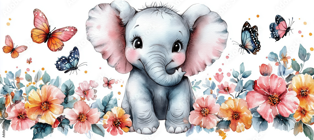 • Uroczy, mały słoń siedzi pośród kolorowych kwiatów i motyli. Obrazek jest pełen delikatności, radości i dziecięcego uroku, idealny do ilustracji dla najmłodszych.
