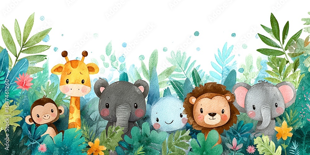 Dla Dzieci - AKWARELOWE ZWIERZĘTA DŻUNGLI W TROPIKALNEJ SCENERII #1647461260