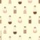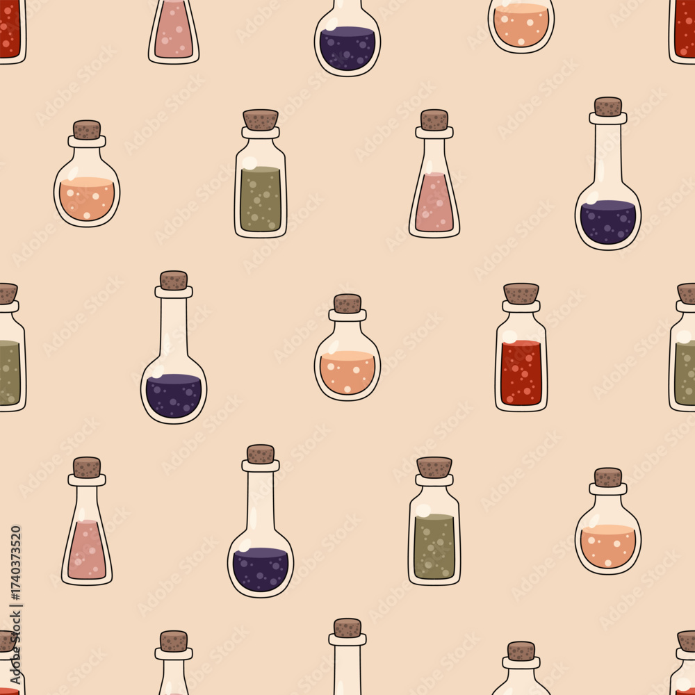 • Bezszwowy wzór z magicznymi buteleczkami eliksirów na Halloween - kolorowe mikstury w szklanych fiolkach z korkami na beżowym tle