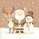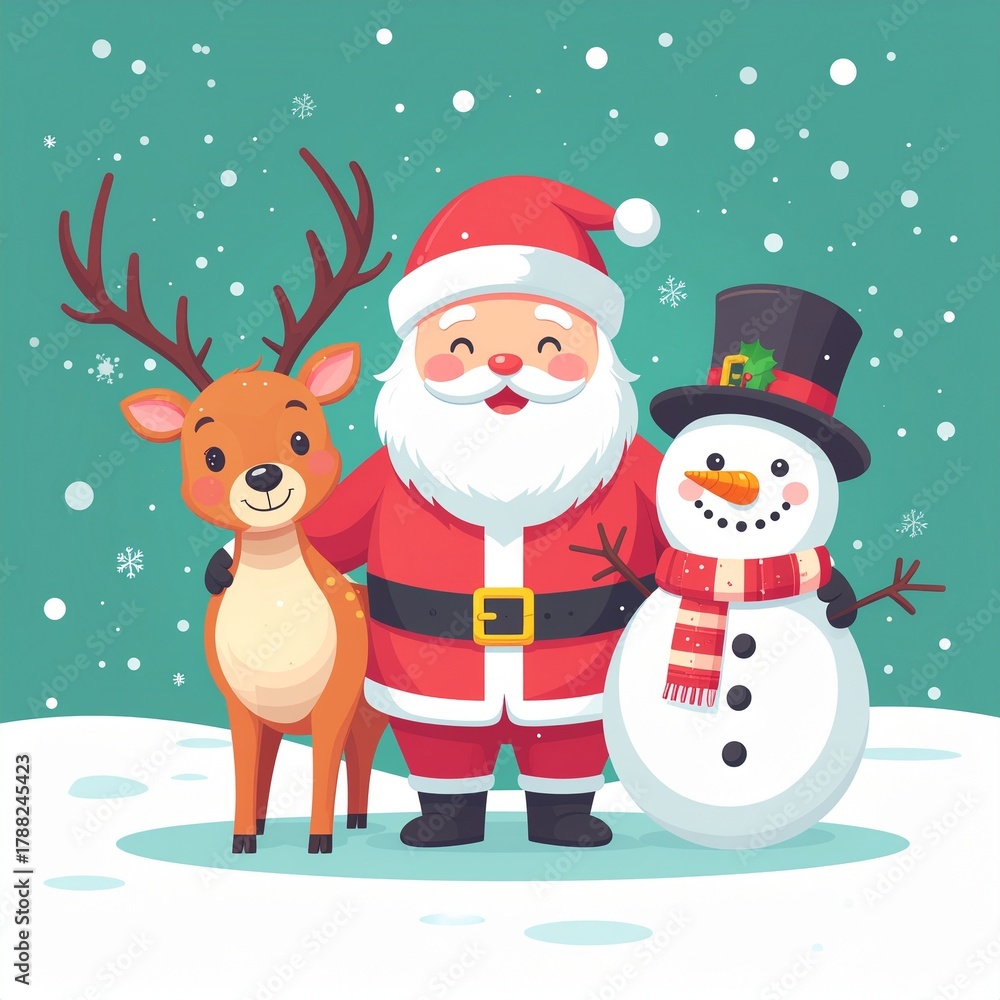 • Świąteczne ilustracja ze Świętym Mikołajem, bałwankiem i reniferem