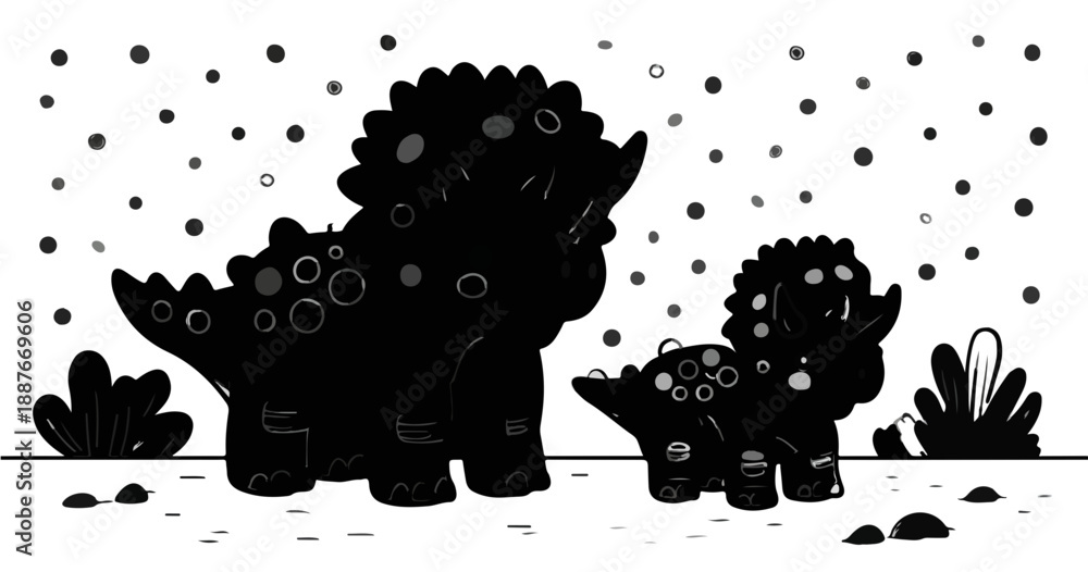 • Czarno-biała ilustracja sylwetek dwóch triceratopsów, rodzica i dziecka, na przezroczystym tle.